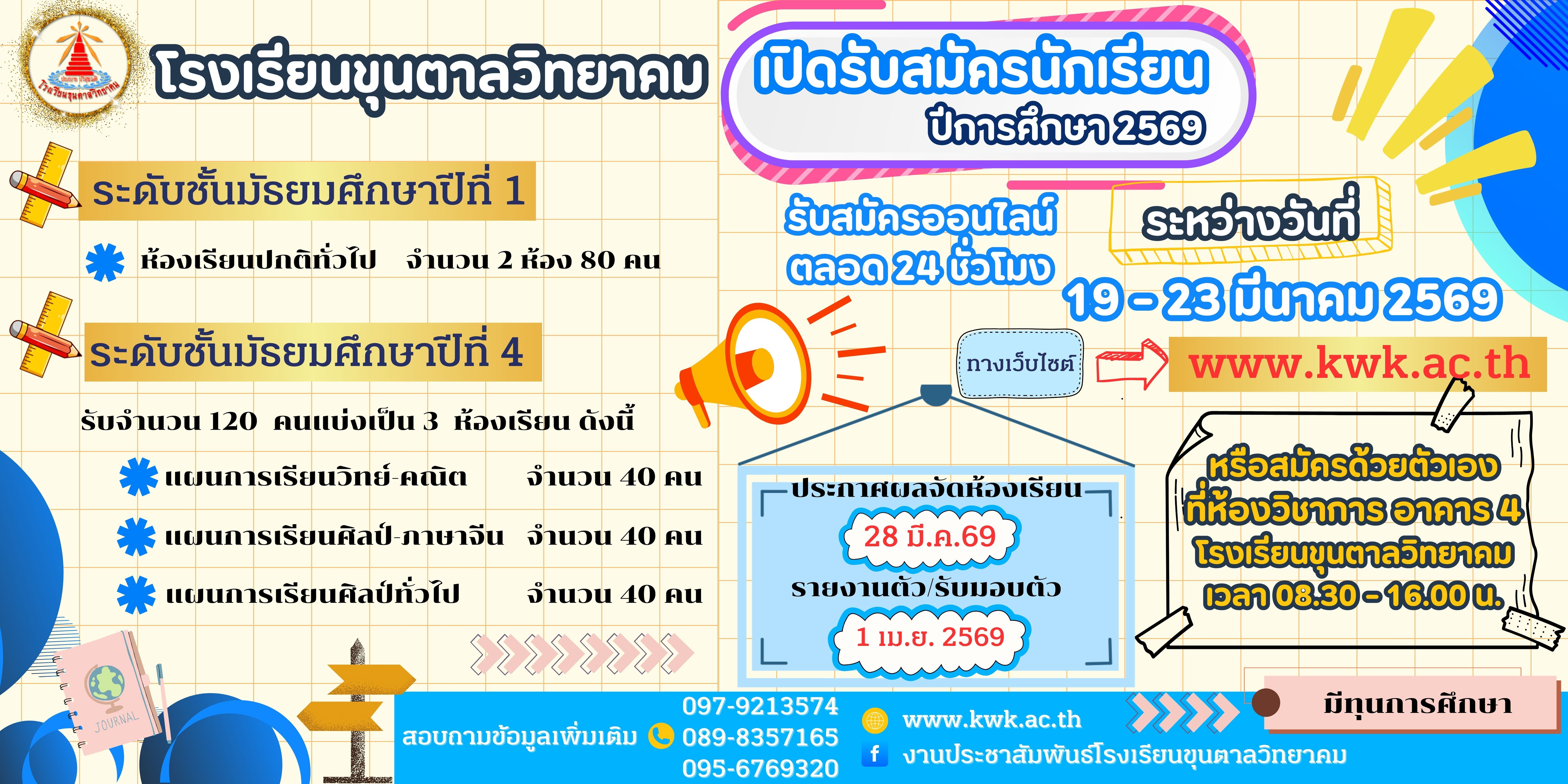 ประกาศโรงเรียนขุนตาลวิทยาคม เรื่อง การรับสมัครนักเรียนชั้นมัธยมศึกษาปีที่ 1 และ ชั้นมัธยมศึกษาปีที่ 4 ปีการศึกษา 2569 24 ก.พ. 69